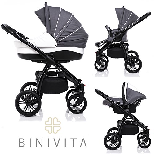 bieten Binivita® Indigo Black Collection Matt Kinderwagen Kombikinderwagen Kombi 3 in 1 + Babyschale + Buggy-Kinderbuggy-Sportwagen + Babywagen 14-Teile Set inkl. Kinderwagentasche - Grey-Indigo