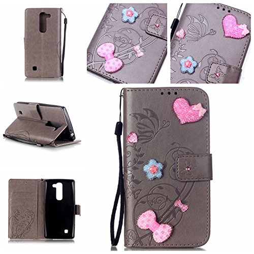 Verkauf Cozy Hut Handyhülle/Lederhülle / Ledertasche / Hülle / Case / Cover / Etui / Tasche Silikon Schutzhülle Für LG MAGNA C90 H502,PU Leder Cover Ledertasche Drucken Diamant Strass Muster bunt Schmetterlings-Blumen Magnetverschluss Magnetic Flip Bookstyle Multi-Function Protektiv Kunstleder Case Tasche Hülle Schutz Etui mit Ständer Halter - grau
